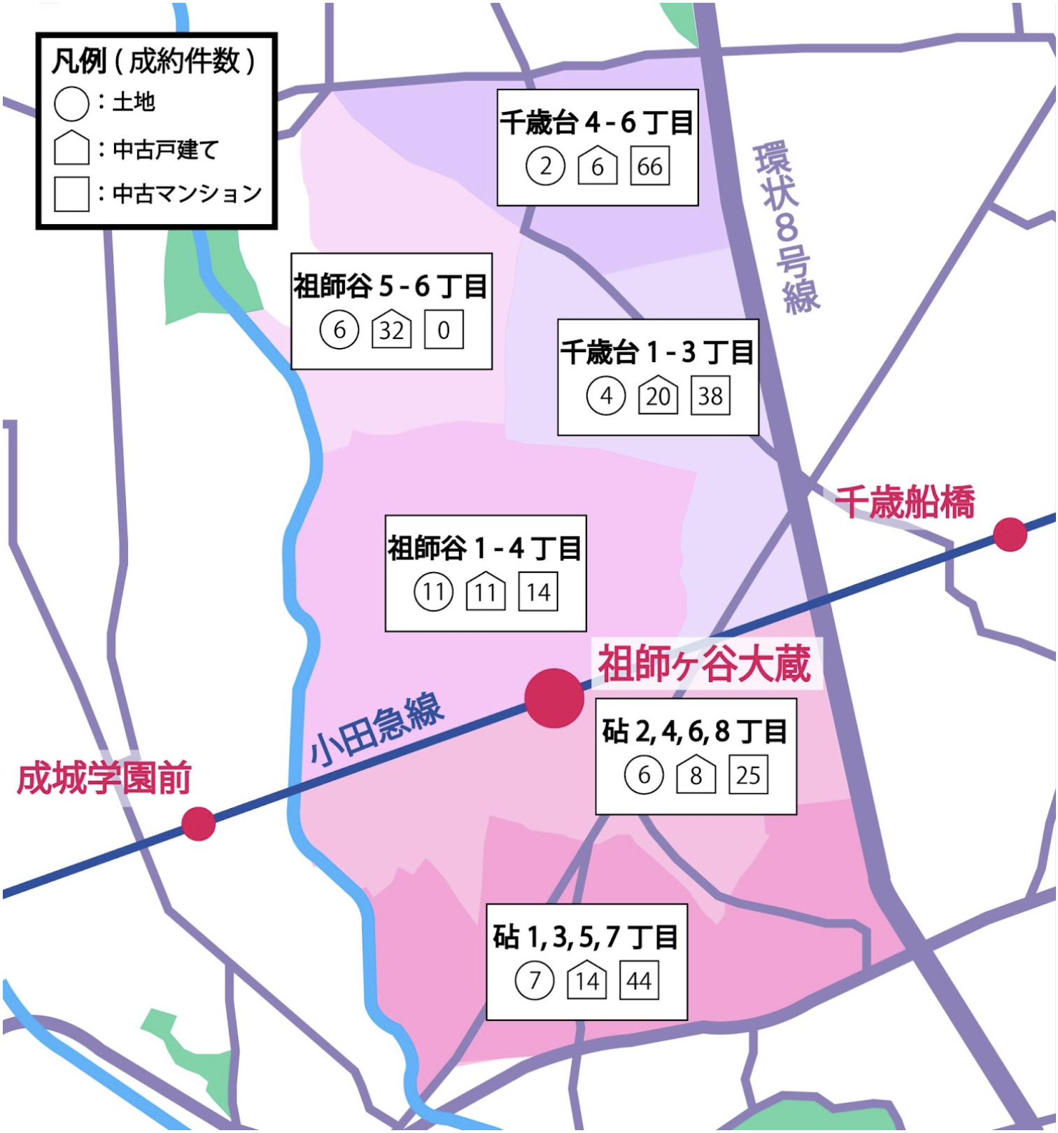 “祖師谷” “千歳台” “砧” 3つのアドレスの過去3年間の成約データを集計すると、土地の取引きは36件、中古戸建ては91件、中古マンションは187件でした。
