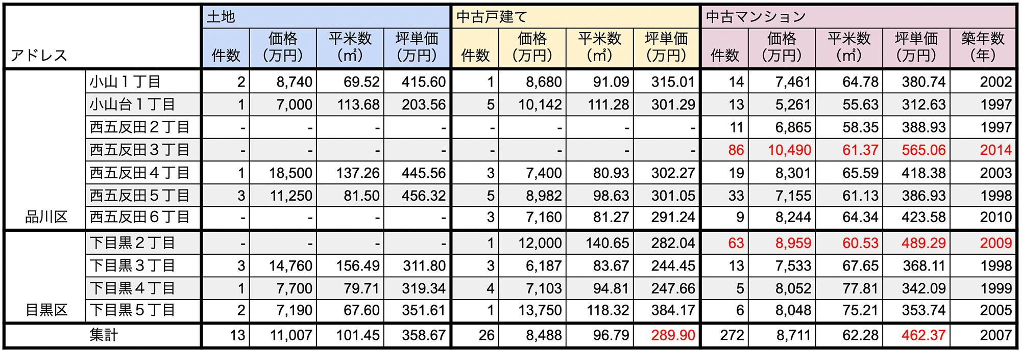 アドレス毎に細かく成約を見てみると、以下のチャートのような結果に。中古マンションの成約件数が集中している「西五反田3丁目」「下目黒2丁目」は、品川区・目黒区それぞれの中で最も高価格であることが分かります。
