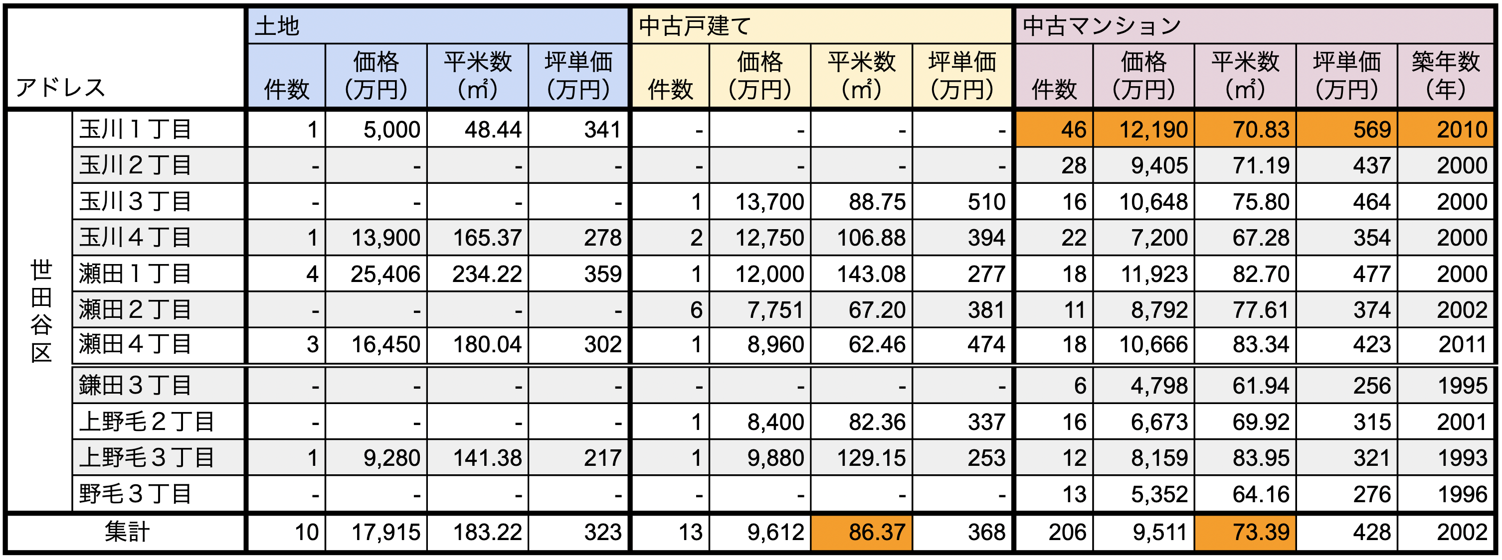 ▲ 東日本流通機構(REINS)に登録された、過去3年間(2021/8/1-2024/7/31)の成約事例を集計したもの(オーナーチェンジ物件を除く)。いずれも「二子玉川」駅より徒歩15分圏内(かつ都内)のみを集計しており、同アドレス内でもそれを超えるものや未登録物件はカウントしていないため、全成約を網羅できているものではないことをご了承いただいた上で、ご参考までにご覧ください。(土地 / 建物 / 専有面積45㎡以上、いずれも価格の制限なし)