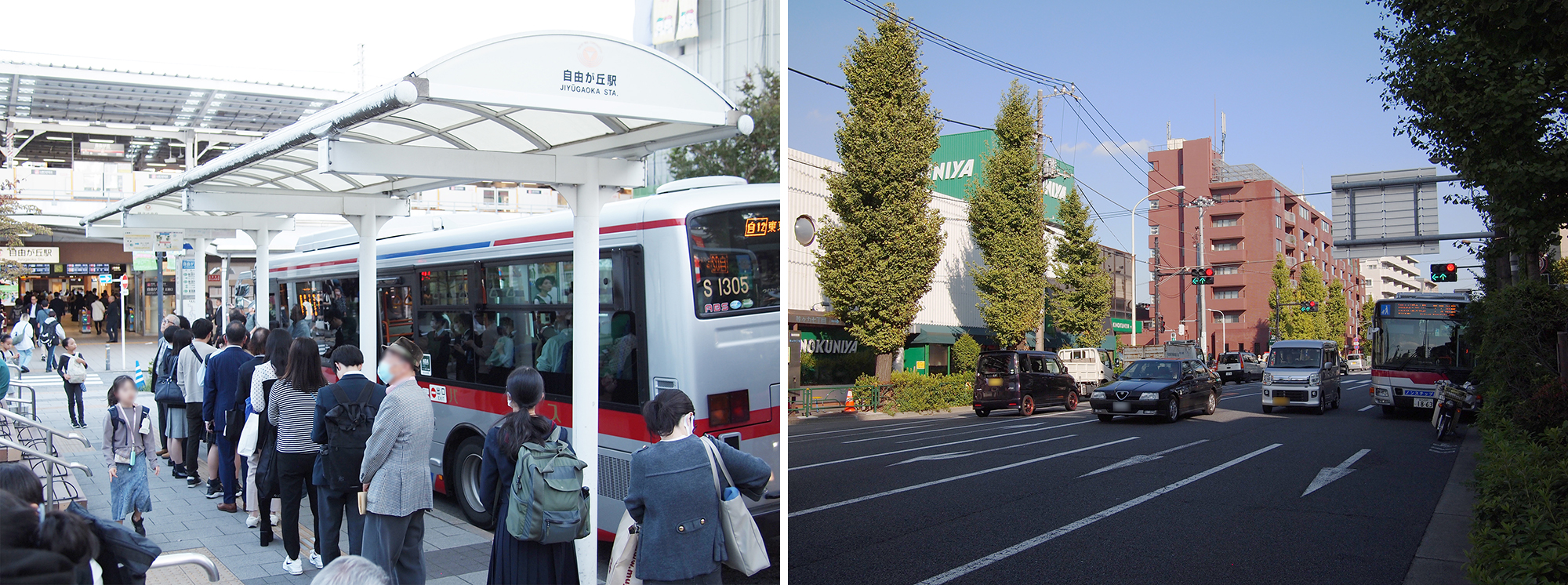 上・平日16時半頃の駅前。バス停には長い列が。/下・目黒通り沿いもバスが頻繁に往来。