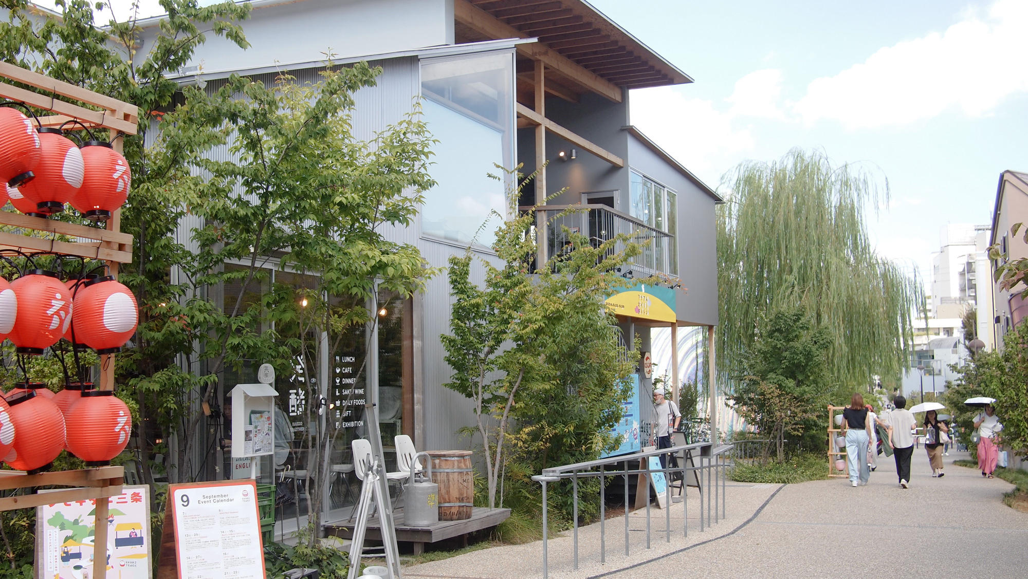長屋風の各棟に飲食店や物販店が入り、2階に住みながら営業も可能という造り。真ん中には椅子やテーブルが並び、定期的にイベントが開催されています。取材日は提灯で彩られていました。