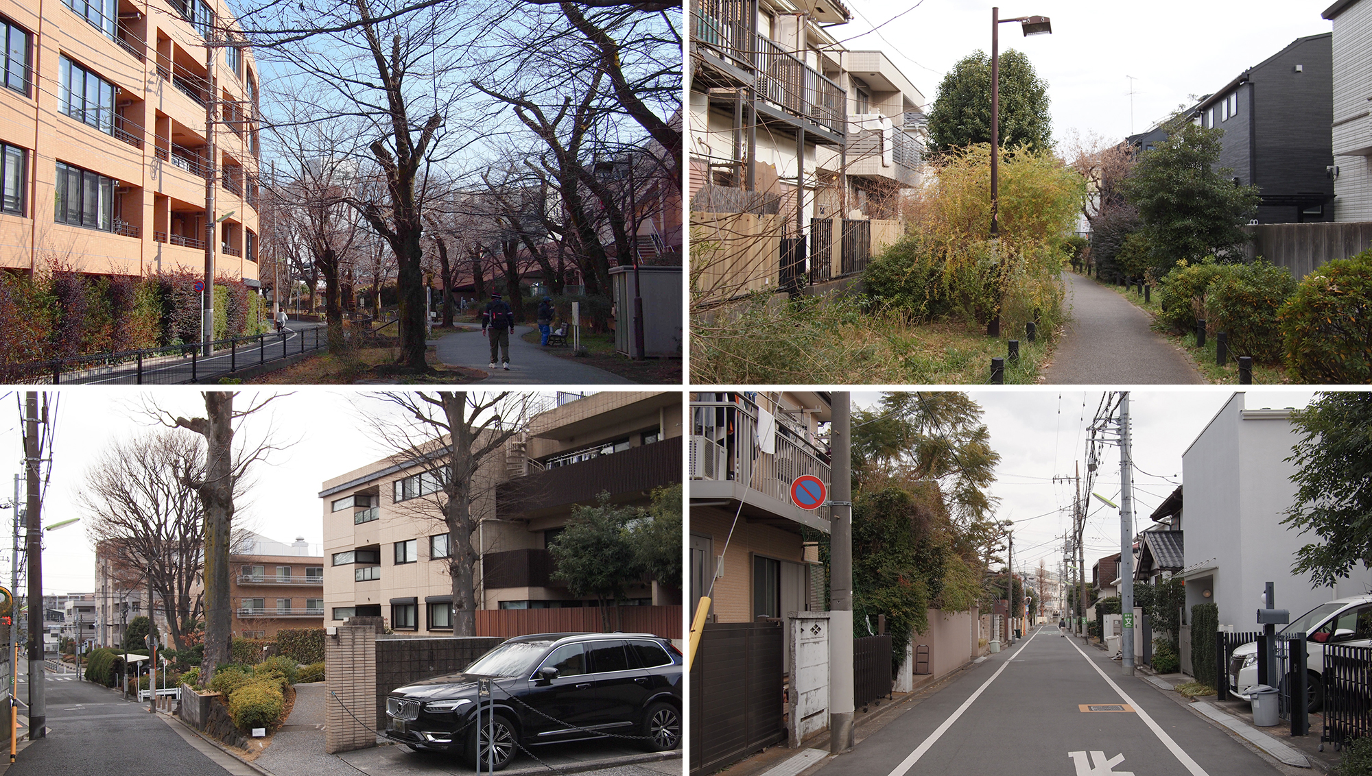 ▲ 左上・烏山川緑道沿いで見かけた「パークハウス経堂」。春は窓の外に桜並木が広がる絶好のロケーション。/右上・緑道沿いに戸建て住宅が並ぶエリアも。/左下・“宮坂” にはヴィンテージマンションも並んでいます。/右下・街の大部分は閑静な住宅街。