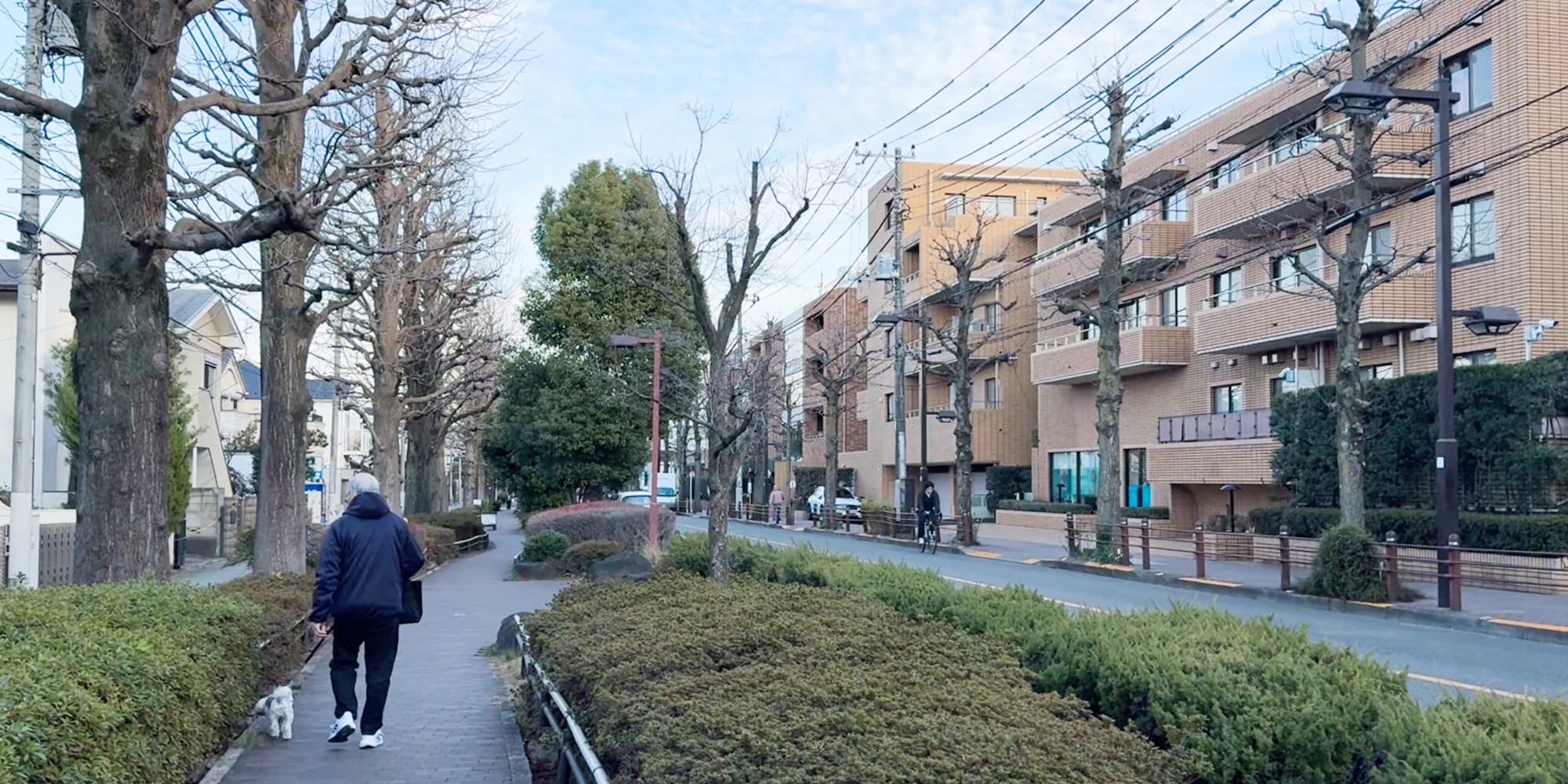 ▲ 北沢川緑道・ユリの木通り。通り沿いには立派なマンションが並んでいて圧巻。この道をまっすぐ進めばすぐに “豪徳寺エリア”。